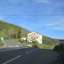 El ascenso hacia el collado Madariaga y Azurki discurre por uno de los paisajes más genuinos del interior guipuzcoano, un entorno dominado por bosques húmedos, caseríos dispersos y laderas verdes que trepan hacia las sierras del interior. La carretera, estrecha y sinuosa, asciende de manera constante por un valle cada vez más cerrado, ofreciendo una experiencia típicamente vasca: pendiente sostenida, vegetación densa y un ambiente de montaña que se intensifica según se avanza hacia las cotas superiores.