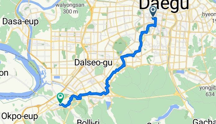 Spin out of central Daegu on mostly quiet neighborhood roads and head southwest toward Dalseong County. It’s about 17 km with gentle rolling ups and downs (around 175 m total ascent), staying low the whole way—nice for an easy-paced ride. Expect a couple of brief busy crossings, but otherwise it’s calm, paved riding with the option to dip onto riverside stretches if you want extra scenery.